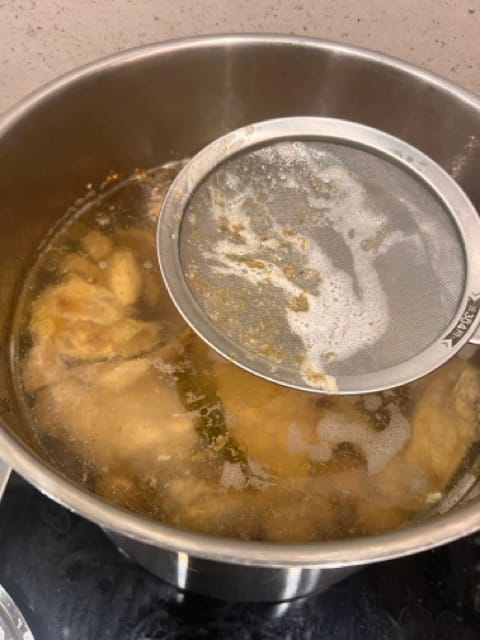 Strain the meats, throw away the water, and wash the meat thoroughly under cold running water, getting your fingers into all the joins to make sure they are clean of scum. Clean the stock pot.