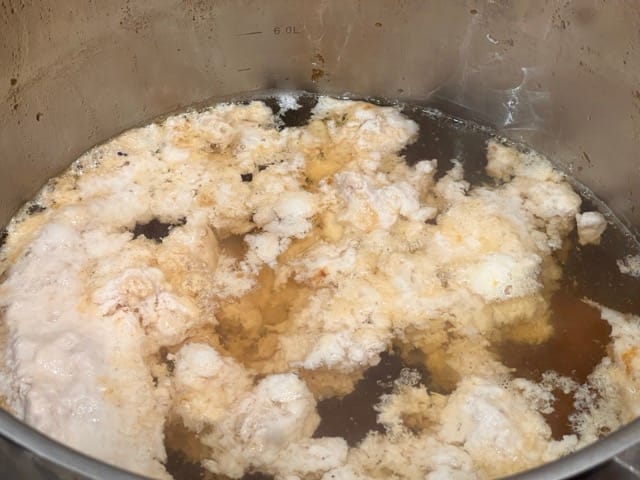 Boil the stock vigorously in the wok until it turns fully white, at least 20 minutes. Then let it boil slowly for up to an hour. Keep adding boiling water if the water level falls below that of the floss.
