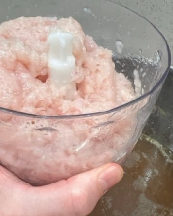 Dice or coarsely blend the chicken breasts and the egg whites to make a yucky pink paste. Don't pulverise it completely, you want some small lumps in there - a few pulses in a food processor will do.