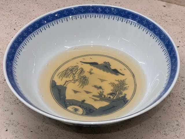The refined stock can then be frozen in ice cubes for future use, or drank as-is. It will be beautifully clear - if somehow it isn't repeat the clarification process a second time after the soup calls. Here's a picture of the stock in a bowl with a pattern on the bottom: