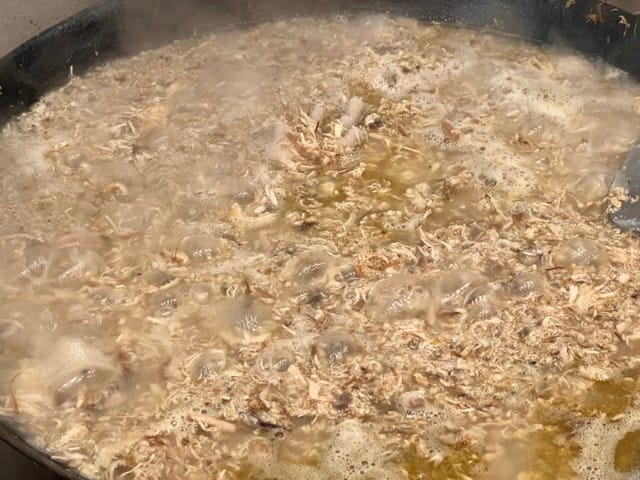 This continuous stirring turns out to be pretty hard work, since the meat floss is initially heavy, but it gets lighter as more moisture evaporates. Stop when the floss is light, fluffy and has some golden brown bits.