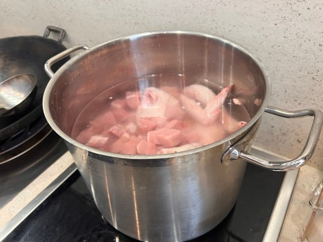 Put cold water in a stock pot, a tablespoon of salt, the chicken, the pork and the ham bones. Gently warm up the water till boiling point, skimming off scum (coagulated proteins and other impurities) until the ingredients change colour and scum has stopped oozing out. Don't boil it for more than a minute or so though.