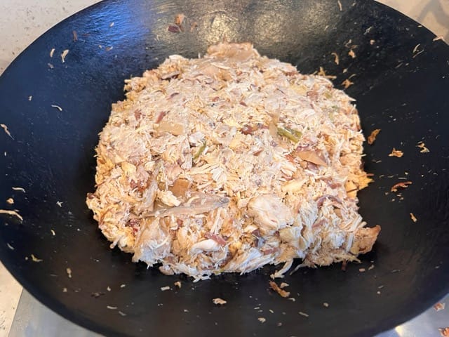 Squeeze as much liquid as you can from the cold leftovers and add to the stock liquid. Then remove any bones from the leftovers by hand, shred up the bits of flesh like making dry "pulled" pork and putting them into a dry iron or steel wok without oil.