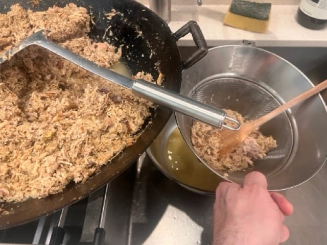 Turn off the heat, strain through a fine-meshed chinois sieve, using force to extract as much liquid out of the remaining meats as possible.