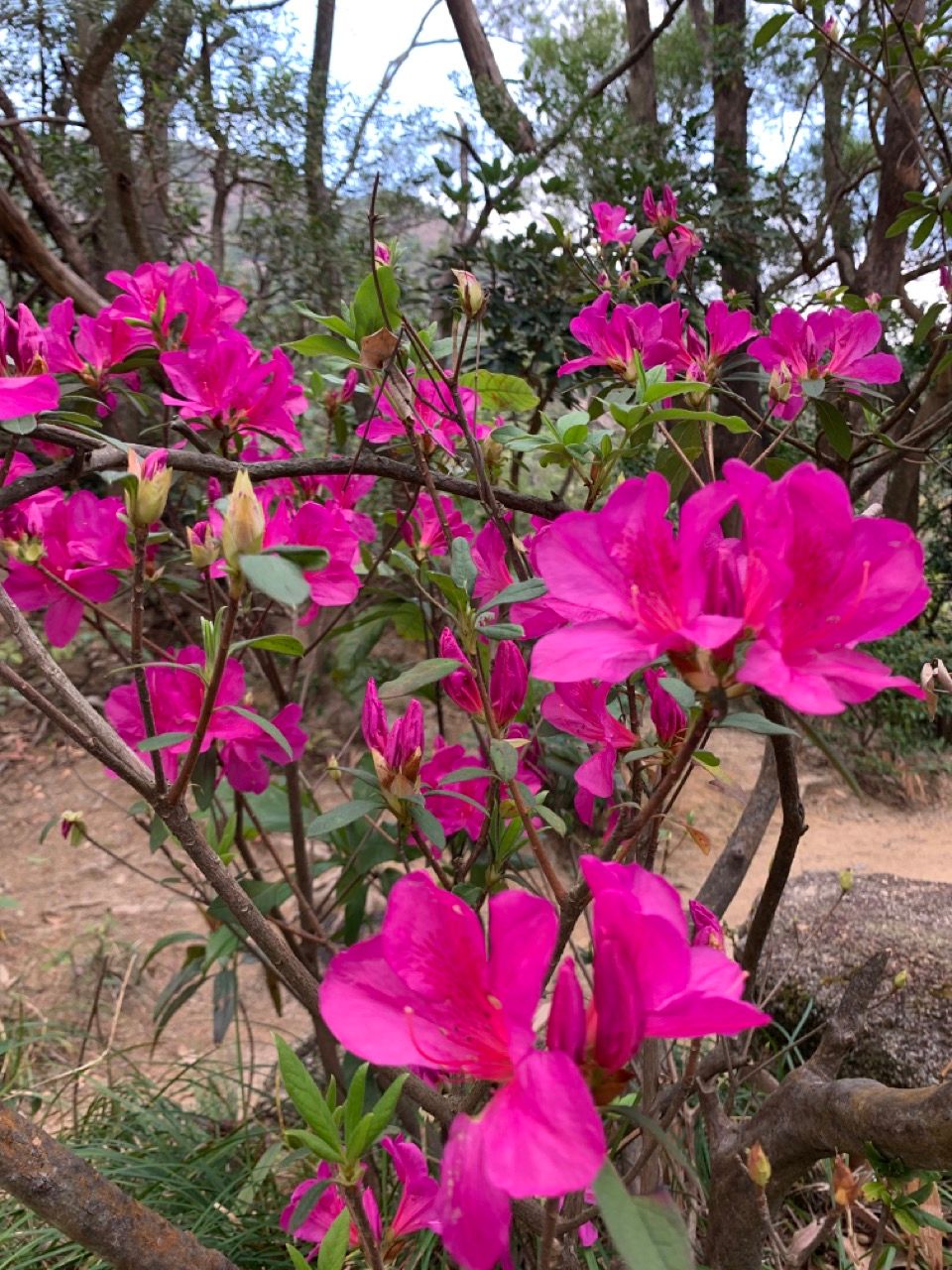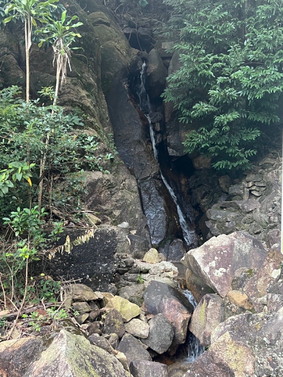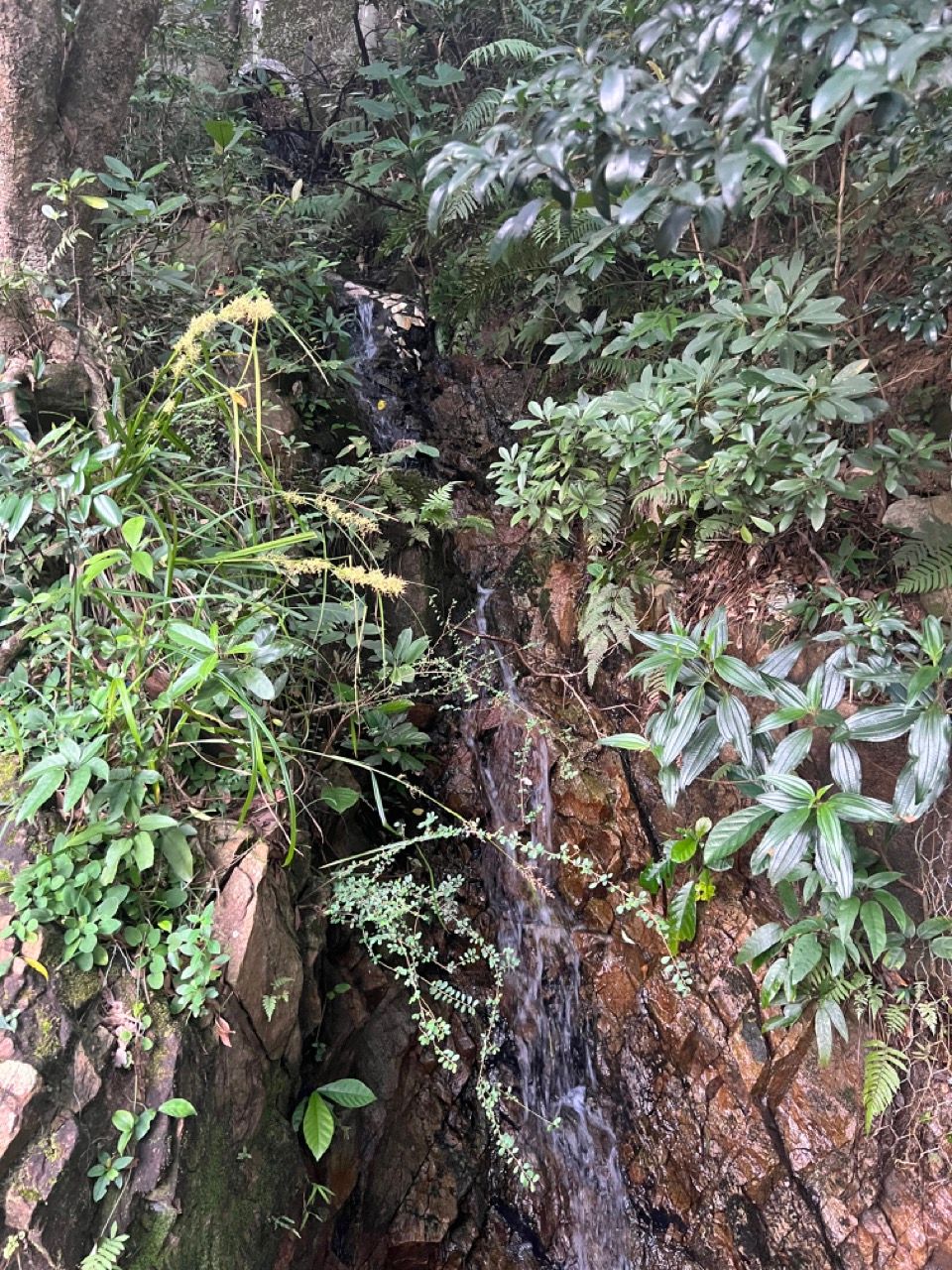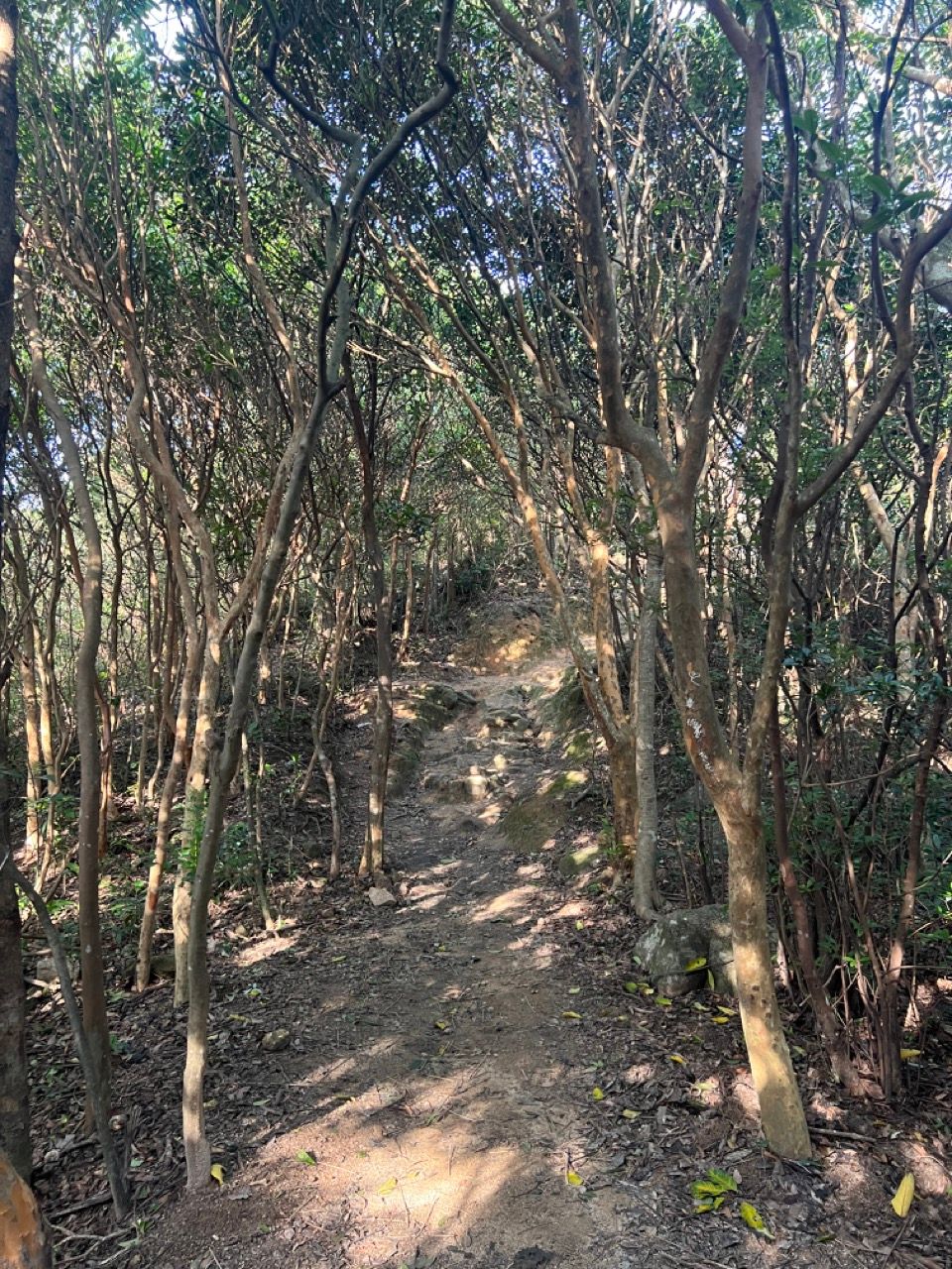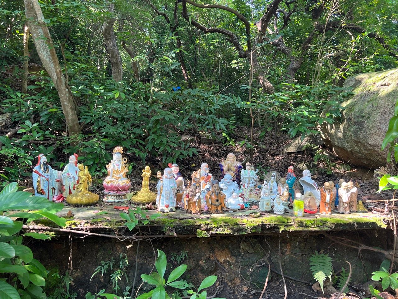 However in the early stages of the trail, there's a detour that one can take to bypass some of the newer concrete path and switch to taking a slightly overgrown abandoned older trail. The latter is a more interesting route and it's not really possuble to get lost since the trail rejoins the newer one slightly further ahead. The older trail requires jumping over some tree branches but also goes through an area with some convenient sitting stones and a collection of buddhist figurines and is normally rather peaceful on crowded weekends since few people take the route.