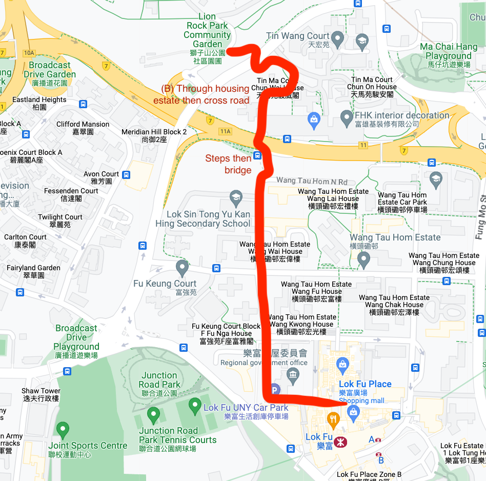 With all that waffle out the way, here's the route I normally take. Start by taking the MTR (subway) to Lok Fu station, and follow the route I've overlayed on Google Maps here. You're walking from the station to LionRock Park Community Garden, but google itself does a horrible job of finding the best route! This is only about a 10 minute walk; I've annotated in red below where you walk up some steps and cross the busy Lung Cheung Road via a bridge, and then walk through the Tin Ma Court housing development on the other side then walk carefully across the smaller Chuk Yuen Road.